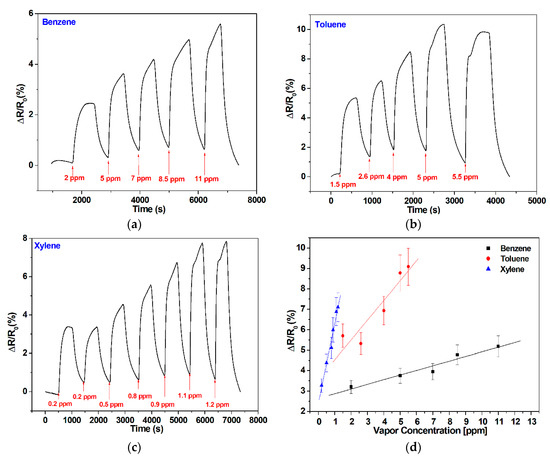The responses of the WO3/graphene-based sensor operated at 250 °C towards the vapors of benzene, toluene, and xylene are presented in Figure 5.