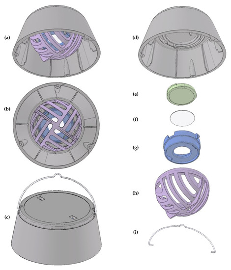 Figure 1. The assembled low-cost passive sampler, shown from (a) side, (b) bottom, and (c) top, and its components, including the (d) cap, (e) base for paper filter exposure surface, (f) paper filter exposure surface, (g) clamp for paper filter exposure surface, (h) protective cage, and (i) wire for hanging sampler.
