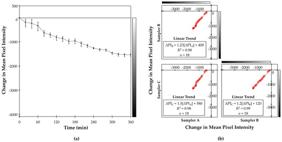 Figure 2. Change in reflectance of three samplers with exposure to kerosene smoke in a laboratory chamber. Change in reflectance (measured by change in mean pixel intensity (ΔPI; unitless) and illustrated by grayscale) ranges from 0 (indicating no change in grayscale) to −4095 (indicating a change in from perfect white to perfect black). (a) Average change in reflectance of samplers versus time in kerosene smoke exposure chamber. Points indicate the mean and error bars indicate the range of change in reflectance for the three samplers placed together in the exposure chamber. (b) Scatterplot matrix of change in reflectance of three samplers (Samplers A, B, and C) placed together in the exposure chamber.