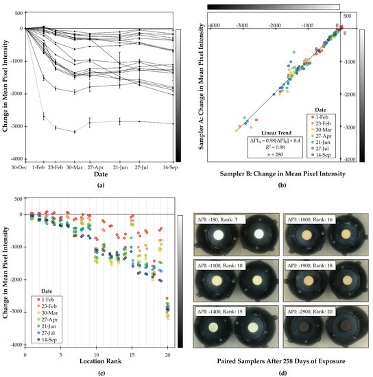 In addition to variability in quantitative measures of reflectance (based on grayscale digital images), locations displayed high variability in qualitative color of paired samplers (Figure 3d). The present study used only monochrome images to quantify differences in grayscale among filters; future research could potentially explore differences in color among filters, an approach applied in prior work [10,22,30].