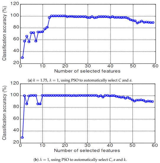 From these results, four observations can be obtained: (1) the feature subsets selected by the mMRM commonly yield higher accuracy than the use of all 59 features; (2) although the computational time of the PSO-LSWSVM (PSO: 30.52 s + LSWSVM: 0.422 s) classifier is higher than the KNN (0.125 s), PNN (0.109 s) and the PSO-LSRBFSVM classifier (PSO: 24.49 s + LSRBFSVM: 0.375 s), it gives much better performance. It should be notice that although the PSO requires a higher computational time, however the PSO training is done offline, and thus it will not affect to the real time fault diagnosis; (3) comparison results between Figure 12 with Figure 8, Figure 9 and Figure 10 shown that the LSWSVM classifier provides better accuracy compared to the KNN, PNN and LSRBFSVM classifiers; (4) by comparing Figure 11 with Figure 10 and Figure 13 with Figure 12, it is clear that using the PSO for parameters selection always provides better performance than using the random selection. In addition, comparisons between Figure 13a–c shown that all parameters, , k, a and C, have significant effects on the performance of the LSWSVM classifier, and that the selection of four parameters simultaneously will produce better generalization performance. Based on Table 2 and the forward selection search algorithm [29], 8 features, 17 features, 20 features and 2 features are selected as the optimal feature subset for the KNN, PNN, PSO-LSRBFSVM and PSO-LSWSVM classifiers, respectively.