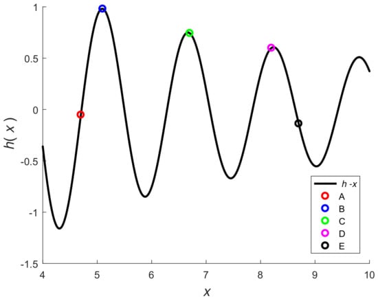 To explain the key concepts of nonlinearity, consider the scalar function shown in Figure 1. We observe in Figure 1 that the function is nearly linear at A and E. If we draw a tangent to the curve at A and E, then the curve is close to the tangent in the neighborhood of A and E. However, tangents to the curve at points B, C, and D differ by large amounts from the curve in the neighborhood of these points. The tangent represents an affine approximation to the curve at a point. We observe that, among points B, C, and D, the curve bends the most at B and the least at point D. If we draw a circle (called the osculating circle) at these points, then the radius of the circle can be used to judge nonlinearity. The rate of bending is high when the radius of the circle is small. In differential geometry [37,38], the curvature is inverse of the radius of the osculating circle and, hence, curvature can be viewed as a measure of nonlinearity. The radii of the osculating circles at A and E are nearly infinity and, hence, the curvatures are nearly zero. From Figure 1, we observe that, in general, the nonlinearity of a function can vary with x. Hence, the nonlinearity is a local measure. If the second derivative of a function is non-zero, then the function is non-linear.