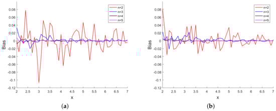 In general, the MLE for a nonlinear measurement model is biased [51]. We can calculate the variance of under the small error assumption using the linearization approximation. To guarantee the validity of the variance, the bias in the MLE must be calculated. The bias can be numerically calculated using Monte Carlo simulation.