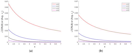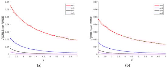(a) or RMSE vs. x using 10 scalar measurements and (b) or RMSE vs. x using 20 scalar measurements.
