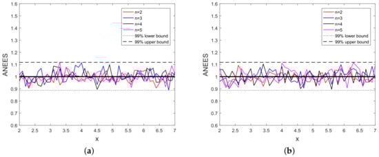 (a) ANEES vs. x using 10 scalar measurements and (b) ANEES vs. x using 20 scalar measurements.