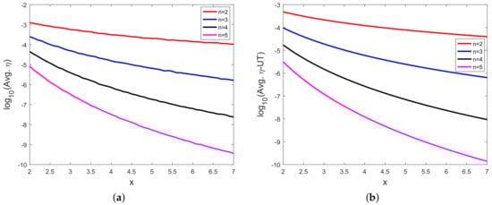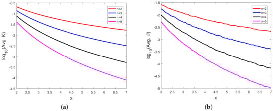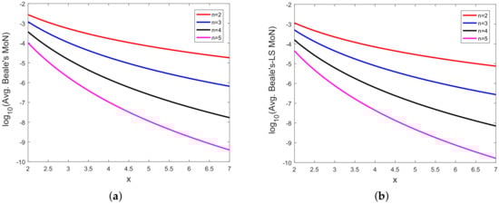 (a) Logarithm of Beale’s MoN ((Avg. Beale’s MoN)) vs. x and (b) logarithm of Beale’s MoN using LS ((Avg. Beale’s-LS MoN)) vs. x with 10 scalar measurements.