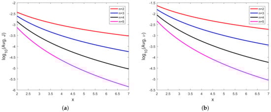 (a) Logarithm of Li’s un-normalized MoN ((Avg. J)) vs. x and (b) logarithm of Li’s normalized MoN ((Avg. J)) vs. x with 10 scalar measurements.