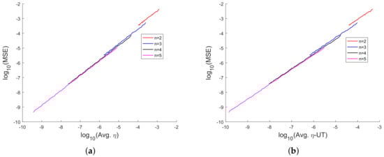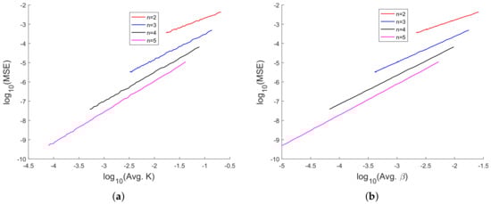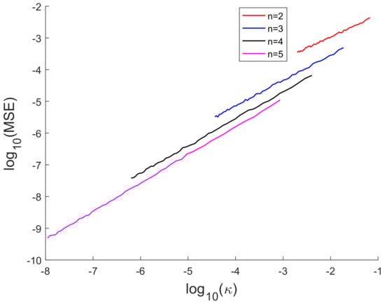 In [35], we had shown analytically, and through Monte Carlo simulation, that affine mappings exist among (MSE), (), (Avg. K), and (Avg. ). In Figure 13, Figure 14, Figure 15, Figure 16, Figure 17 and Figure 18, we have plotted the (MSE) versus of various MoNs using 10 scalar measurements. These figures show that the (MSE) varies with (MoN) according to an affine mapping with a positive slope. This implies that the MSE increases as an MoN increases. We obtain similar results for the case of 20 scalar measurements.