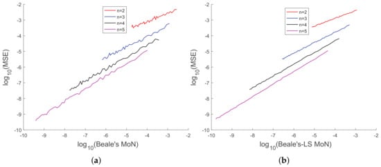 (a) (MSE) vs. (Avg. Beale’s MoN) and (b) (MSE) vs. (Avg. Beale’s MoN using LS) using 10 scalar measurements.