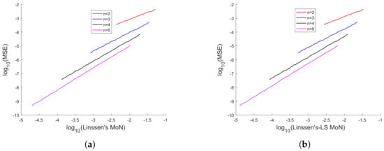(a) (MSE) vs. (Linssen’s MoN) and (b) (MSE) vs. (Linssen’s-LS) using 10 scalar measurements.