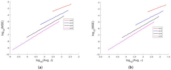(MSE) vs. logarithm of Li’s MoN. (a) (MSE) vs. (Avg. J) and (b) (MSE) vs. (Avg. ) using 10 scalar measurements.