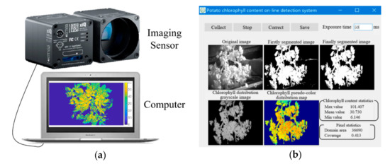 In order to realize the real-time detection of SPAD value of potato plants in field, in this research we designed and developed the control software of this spectral imaging sensor using C++ language based on the Qt Creator 4.9.1 platform under a Windows operating environment. The user interface shown in Figure 2b was designed based on the Qt Widgets Application. The image processing functions were realized by calling the OpenCV libraries. The main functions of the software included the following: spectral image collection, exposure time adjustment, spectral image correction, SPAD value pseudo-color expression, SPAD value statistics, and image saving. The operation of the control software was friendly and convenient.