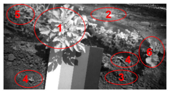 Image of a potato plant at 888 nm in the field. 1: target plant, 2: mulch film, 3: soil, 4: residual straw; 5: weeds, 6: non-target potato plant.