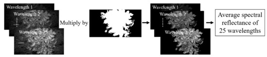 After the segmentation of potato plants, the spectral reflectance at 25 wavelengths were extracted by mask image for establishing the detection model. The spectral reflectance extraction process is as follows: (1) the corrected spectral images of 25 wavelengths were respectively multiplied by the mask image, then the spectral images of potato plants were obtained. (2) The average reflectance of whole potato plant at 25 wavelengths was calculated. The illustration of spectral reflectance extraction is shown in Figure 5.