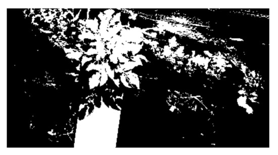 The modified difference vegetation index (MDVI) along with Otsu algorithm (MDVI–OTSU) was applied to eliminate the noise information and to perform the preliminary segmentation of potato plants. In order to highlight the role of MDVI, an image at 887 nm was segmented by using only the Otsu algorithm, and the result is shown in Figure 6. There was a certain removal of the soil background and the standard board at two low gray levels. However, this noise information, including mulch film, weed, residual straw, non-target potato plants and standard correction board at two high gray levels were not eliminated because the potato plant, and these noise objects, had similar grayscale values.