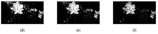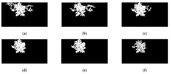 Therefore, the MDVI algorithm was introduced to increase the difference of grayscale values between the target potato plant and the background noises. Only then can the OTSU algorithm fully play the role of image segmentation. The segmentation results using the MDVI–OTSU method under six modified coefficients, 0.5, 1.0, 1.5, 2.0, 2.5, and 3.0, are shown in Figure 7. For MDVI, with the increase of modified coefficient from 0.5 to 3.0, the noises of standard board, soil, weeds, mulch film and residual straws in the image gradually decreased. However, some potato leaves were mistakenly removed as noise, as shown in Figure 7f, when the correction coefficient was too large. Therefore, an appropriate correction coefficient was essential for accurate segmentation of potato plants.