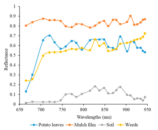 In order to analyze the spectral characteristics of different objects, we manually selected the region of interest of each object. The average reflectance at 25 wavelengths of the target potato plant, soil, weeds and mulch film was manually extracted from the one of corrected spectral images, as shown in Figure 9. Potato plants had low reflectance in the red wavelength due to the strong absorption of the leaf pigment and had the high reflectance in near-infrared wavelengths due to the strong reflection of the cell cavity in leaves. Weeds possessed the similar spectral responses because weeds are also green plants. The mulch film exhibited high reflectance in the range of 660–950 nm, because it was made of polyethylene that had no characteristic absorption in visible and near-infrared wavelengths. However, the reflectance of soil was very low at 25 wavelengths due to the spectral absorption of complex components in the soil.