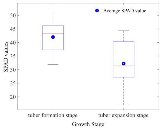 The boxplot of the SPAD value statistics of potato plants at two stages.