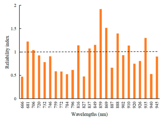 The average reflectance at 25 wavelengths of each potato plant were extracted automatically by using the mask image obtained using the MDVI (2.5)–OTSU–CDL method. Therefore, spectral data of each potato sample consisted of the reflectance of 25 wavelengths. To ensure the stability of the PLS detection model, the sensitive variables of SPAD value were selected by using UVE. The UVE result is shown in Figure 11. The variables with higher reliability index contribute more to the detection model. With a threshold of 1.0, 10 wavelengths were selected as the sensitive variable, and they were 681, 706, 816, 837, 849, 859, 869, 888, 910, and 935 nm.
