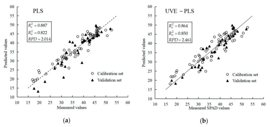 The determination coefficient of calibration set () of PLS (0.887) was higher than that of UVE–PLS (0.864) because the PLS model possessed more input variables. However, The RPD of UVE–PLS (2.461) model was higher than that of PLS (2.014), which demonstrated that the UVE–PLS had good stability. The RMSEV of UVE–PLS (3.315) was lower than that of PLS (3.810), which revealed that the former had excellent predictive accuracy. The prediction results of PLS and UVE–PLS model are shown in Figure 12. Compared with the prediction results of PLS (Figure 12a), the predicted values of validation set of UVE–PLS were evenly distributed in both sides of the 1:1 line, which further illustrated the performance of UVE–PLS model was better for the SPAD value detection of potato plants.