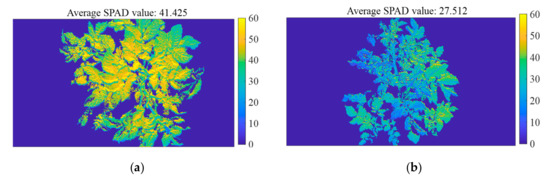 Two potato plant samples were randomly selected from the tuber formation stage and tuber expansion stage, respectively. The pseudo-color visualization distribution map of SPAD value of two potato plants was drawn according to that explained in Section 2.5. The result is shown in Figure 13. The average SPAD values of the potato plants were 41.425 at S1 and 27.512 at S2. In the pseudo-color map, different SPAD values at each pixel were represented by different colors, and the color ranged from blue to yellow (blue–green–yellow), which in turn indicated that the SPAD value was from low to high. The background color was blue, which indicated that the SPAD value was 0.