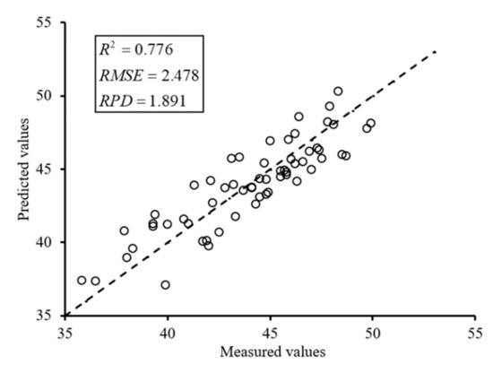 In order to test the performance of developed SPAD value detection system such as the stability and applicability, the MDVI (2.5)–OTSU–CDL method was employed to segment the potato plant and further extract the spectral data of testing dataset (60 samples), and the spectral data were substituted into the UVE–PLS detection model to predict SPAD value. The scatter plot of 1:1 was created, as shown in Figure 14, to visually demonstrate the SPAD value prediction results. The UVE–PLS model showed a strong R2 value of 0.776 and a small RMSE value of 3.621, which illustrated that the developed system possessed good detection capability. These SPAD value values were evenly distributed on both sides of the 1:1 line, further illustrating that the developed system possessed good stability.