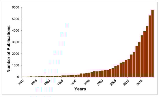 Number of publications published on the topic of the review in the last 50 years. Search keywords: “real-time water quality sensors”. Scopus (October 2019).