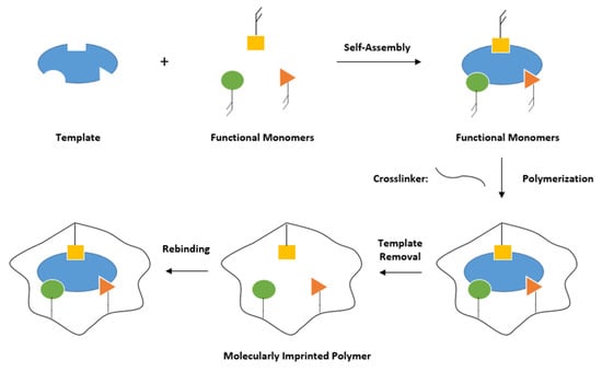 MIPs are generally synthesized by co-polymerization of functional and cross-linking monomers in the presence of a template (see Figure 4). Initially, a complex forms between functional monomers and the template through weak, noncovalent interactions (mainly hydrogen bonds, Van-der-Waals or π-π interactions), followed by polymerisation with cross-linking monomers to form a rigid, three-dimensional polymeric network. Removal of the template leads to recognition sites (cavities) within the polymer that are complementary to the target molecule in size, shape, and chemical functionality and are suitable to selectively rebind the analyte [25].