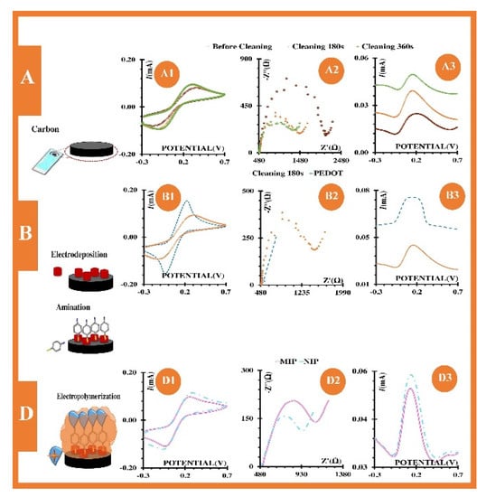 In 2018, Ayankojo et al. introduced a sensor system capable of detecting pharmaceutical pollution in aqueous solutions [29]. They chose amoxicillin as the model analyte and implemented a hybrid MIP, consisting of organic and inorganic components, on the gold surface of a surface plasmon resonance (SPR) transducer. The hybrid MIP film was synthesized by applying the sol-gel technique and using methacrylamide as organic monomer and vinyltrimethoxysilane as inorganic coupling agent to form a stable and rigid polymeric network. Sol-gels have a highly porous structure and recognition sites are usually formed in a more ordered way. This results in enhanced sensitivity and faster sensor response times. Rebinding experiments of the amoxicillin MIP in phosphate-buffered saline (PBS) and tap water revealed an imprinting factor of 16 compared to the nonimprinted polymer (NIP) and a limit of detection LoD = 73 pM. Furthermore, the MIP responded almost exclusively to its target analyte thus exhibiting utmost specificity. In the same year, the group of Cardoso also developed a sensor for detecting chloramphenicol, an antibiotic used in fish farms [30] (see Figure 5). The corresponding MIPs were electro-polymerized on screen-printed carbon electrodes.