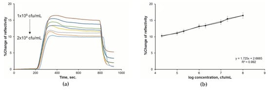 As can be seen from Figure 6, changes in refractive index were linear in a concentration range from 2 × 104–1 × 108 CFU/mL covering four orders of magnitude with a limit of detection of 1.05 × 102 CFU/mL. Selectivity studies with structurally similar bacteria revealed higher affinity of MIP nanoparticles towards the imprinted analyte compared to the other competitors. Selectivity coefficients for E. coli, Staphylococcus aureus and Bacillus subtilis were as follows: 1.38, 1.25 and 1.37.
