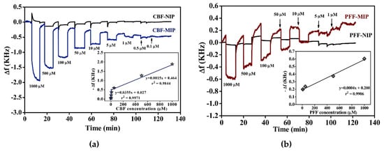 One can clearly see that both CBF and PFF MIPs led to linear sensor responses between 0.5–1000 µM and 5–1000 µM for CBF and PFF, respectively, whereas the frequency signal of the NIP stayed more or less constant.