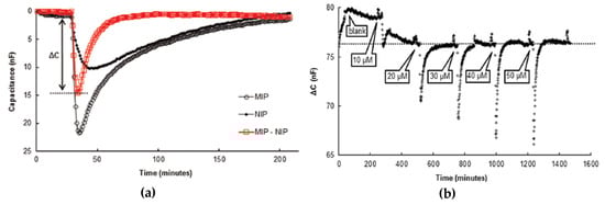 (a) Capacitance (nF) vs. time (min) of MIP, NIP and the differential signal ΔC (MIP-NIP). (b) Differential signal (ΔC in nF)) for different concentrations of metergoline vs. time (min). Reproduced with permission from [37] © Elsevier. MIP: molecularly imprinted polymers, NIP: nonimprinted polymers.