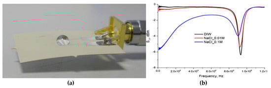 (a) Microwave flexible sensor with 20 µL of water sample placed the silver IDEs and (b) its output sensing response comparing deionized water (DIW), and 0.01 and 0.1 M of NaCl. Reproduced with permission from [49] © 2020 IOP Publishing Ltd.