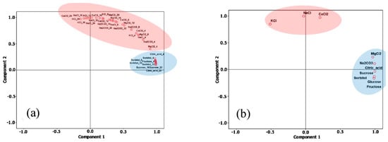 Discrimination between sugars and organic acid (blue oval) and salts (red ovals) using principal component analysis (PCA). (a): magnitudes of the transmission coefficient (S21) between 2.3 and 2.6 GHz; (b): amplitude of S21 at the resonance frequency. Reproduced with permission from [57] © Elsevier.
