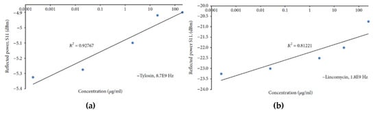 (a) Dependence of the S11-transmitted signal on tylosin and lincomycin at respectively, 8.7 GHz and (b) 1.8 GHz. Copyright © [50] under the Creative Commons Attribution License.