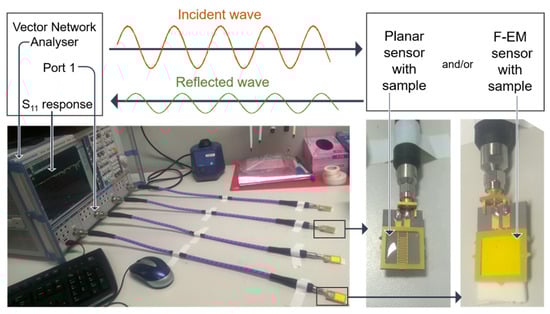 The synergy between microwave sensing technology and chemical materials provides interesting advantages in the field of quality monitoring for adapting this method to a specific purpose and it is consequently a promising area of research and development. The integration of specific materials in the form of thin and thick films onto planar sensors has been recently recognized as a novel and attractive approach for reaching higher selectivity, sensitivity and specificity for a selected material under tests using microwave and impedance spectroscopy [59,62,63,64]. The principle is based on two processes: the sensing process, where the target analyte interacts, via physical or chemical interaction, with the material on the sensing structure, and the transduction process, where the interaction between EM waves, material and sample generate a particular signal [61]. A vector network analyzer is used as a microwave source and can be configured with one or two ports. One-port configuration (S11 measurement) measures the reflection coefficient of a material under test, which depends on how much the incident wave propagates through, or is reflected by the sample. Two-port configuration (S21 measurement) allows for measuring the transmission coefficient, which depends on how much EM power propagates from one port (port 1) through the sample and is received at the second port (port 2). This configuration allows the determination of both transmitted and reflected signals. S-parameters vary with frequency. By functionalizing planar sensors with certain sensitive materials using screen-printing technology, which are defined functionalized electromagnetic sensors (f-EM) sensors, it is possible to obtain the desired sensitivity and/or selectivity to one or more specific analyte in water obtaining an immediate specific response as the sample is placed onto the microwave sensor (uncoated or f-EM sensor) [65] (Figure 12). Accordingly, such work has the foundations for developing new methods, based on EM sensors and functional chemical materials, capable of determining specific chemicals in water, both qualitatively and quantitatively [65]. The sensing response as S11 can be determined by direct contact between the material and the analyte under test, which changes the permittivity of each component, and the consequent overall complex permittivity changes. The improvement can be associated with the increase of material thickness as well as the composition itself [66].