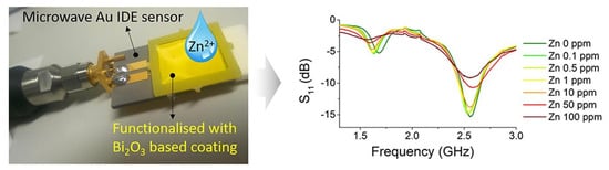 Microwave sensor functionalized with Bi2O3-based coating for the detection of Zn in water (left), and the dependence of the reflected signal (S11) response on Zn concentration (right). Reproduced with permission from [66] © Elsevier.