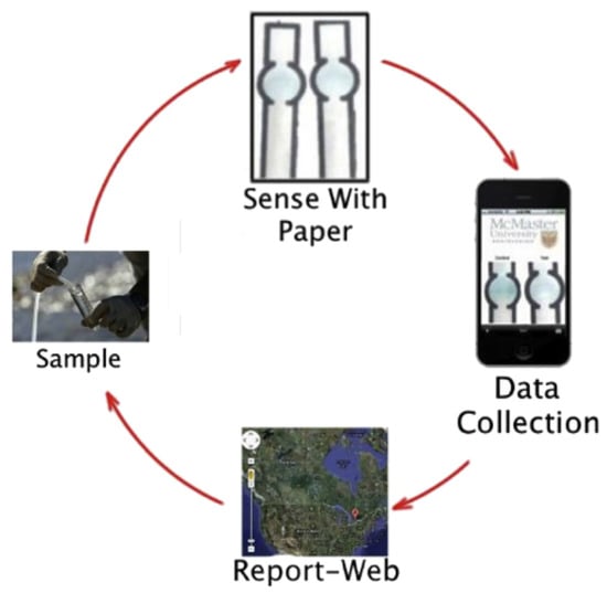 - Sicard, C.; Glen, C.; Aubie, B.; Wallace, D.; Jahanshahi-Anbuhi, S.; Pennings, K.; Daigger, G.T.; Pelton, R.; Brennan, J.D.; Filipe, C.D.M. Tools for water quality monitoring and mapping using paper-based sensors and cell phones. Water Res. 2015, 70, 360–369. [Google Scholar] [CrossRef]