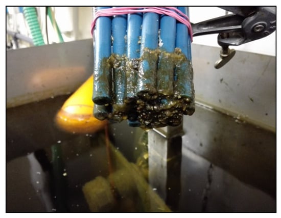 The sensor array after long-term online measurements at an aeration water plant. The sensors were cleaned by intensive washing. In spite of significant contamination, the sensors were stable for at least two months [79].