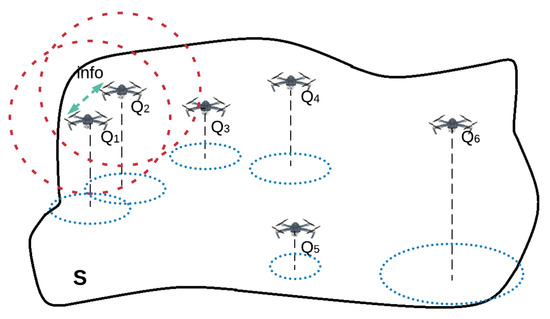 - Communication constraints are considered. A pair of UAVs may communicate if and only if they are within their communication range R, which is small compared to the size of the area S, i.e., .