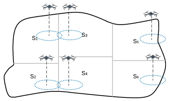 To maximize the frequency of visits (or minimize the elapsed time between consecutive visits) to any position in S, an area partitioning strategy is posed to organize the n UAVs. An optimal area partitioning strategy implies that each UAV has assigned a non-overlapping sub-area with a size according to its sensing coverage, such that the union of them is S (see Equation (1) and Figure 2).