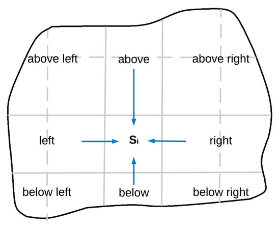 However, the problem is not only to decide the size of area to be assigned to each UAV, but also the shape and position of that sub-area, so that they match the conditions specified in Equation (1). The proposed solution organizes the division of the area as a 2D grid, where each sub-area is related to the rest according to its column and row. Each UAV groups the sub-areas and UAVs into nine sides (see Figure 4). Then, it defines a set of intermediate variables to model these sides: the polygons which define the areas (, , , , , , , , ) and the sum of covering speeds (, , , , , , , , ) on each side. Superscripts al, a, ar, l, r, bl, b and br indicate that the considered variable refers to the side above left, above, above right, left, right, below left, below and below right, respectively.