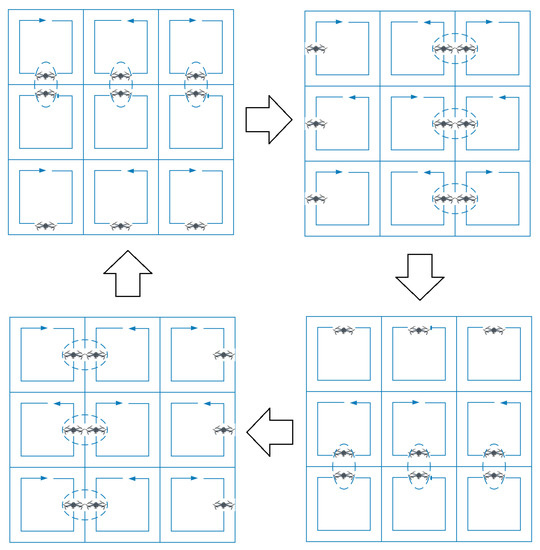Then, the UAVs take off and start following their own paths. When a UAV reaches a position included in , it waits to meet its neighbor to share and update the appropriate intermediate variables. These intermediate variables must be updated by and , depending on their relative positions. If is the left neighbor of , will update its intermediate variables using information provided by , according to Equation (3). Similarly, will update its intermediate variables using information received from , according to Equation (4).