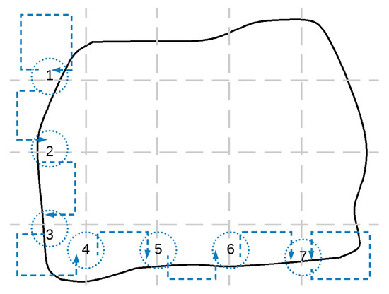 Each UAV knows its covering speed , its initially assigned sub-area and initializes the rest of its intermediate variables to 0 (covering speeds) or ∅ (areas). Then each UAV generates a closed path to patrol its assigned area based on the path planning method proposed in Acevedo et al. [23]. This path visits the list of positions , such that the length between each pair of consecutive positions is always the same. The generated path may achieve periodic communications among neighbor UAVs, since all the UAVs will take the same time to travel between two consecutive meeting positions. The objective is to synchronize the whole multi-UAV system, while maximizing the frequency criterion. Please note that neighbor UAVs must follow their paths in opposite directions to achieve synchronization among them, see Figure 5.