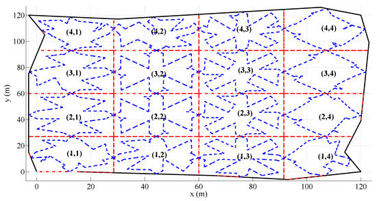 On the other hand, the area partitioning strategies can obtain theoretically the optimal performance, considering UAVs with different capabilities and keeping periodical connectivity [22,23]. This strategy consists on dividing the given area into as many sub-areas as UAVs, being the sub-area size proportional to their covering capabilities. Then, each UAV may generate an only closed path to cover its assigned sub-area.