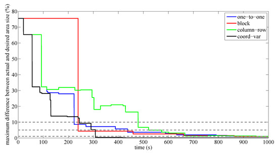 To analyze how the actual area division tends to the optimal one following a frequency-based approach, the maximum difference between the size of the sub-areas currently assigned to the UAVs and the optimal ones (as they are defined in Equation (1)) is computed along time. Results are shown in Figure 9.
