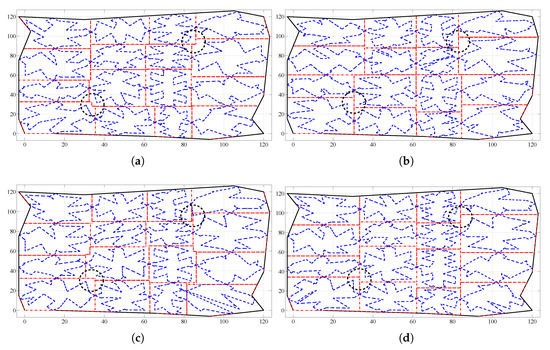 Final area division obtained during the simulation using the coordination algorithms: (a) based on the one-to-one coordination, and (b) based on the (2,2)-block-sharing strategy. (c) based on the column-row decoupling, and (d) based on the coordination variables. The dashed red lines determine the final sub-area shapes assigned to the UAVs, the dashed blue lines indicate their coverage paths generated using the path planning method proposed in Acevedo et al. [23] and the thick dashed black circles highlight two examples of the edges of shapes of the computed sub-areas.