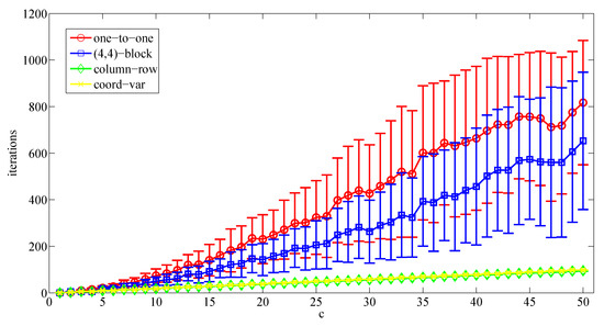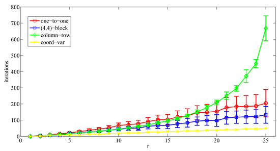 These results show that the proposed solution based on coordination variables converges faster than other approaches to the optimal solution, assuming . The trend of the solution obtained using the proposed method keeps almost constant to the optimal division. Therefore, it is an any-time algorithm since it always provides a better solution while it is running. Meanwhile, the improvement of the solution based on the one-to-one coordination is fast at the beginning (until 10%), but slows down after. Therefore, obtaining a very accurate area division, according to the optimal one defined by Equation (2), may be very slow. Regarding the block-sharing strategy, the results show that this method requires larger slots of time to update the area division. Then, the initial sub-optimal division remains more time, but the improvement of the solution is higher. Anyway, the time required to get accurately a solution close to the optimal is significantly worse than using the proposed method. Otherwise, the solution provided by the column-row decoupled approach is irregular and much worse than the others, showing it as a no any-time algorithm.