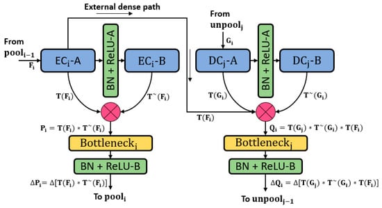 Here, ““ represents the batch normalization and ReLU operation in a combination of channel limitation by the layer, and ”*“ represents the depth-wise concatenation. Similarly, for the decoder (right of Figure 1), the convolutional operation from the first convolution of the decoder -A gives the resultant feature , which is provided to the second convolution of the decoder -B, which alters the feature to . The feature is obtained after two convolutional operations, and the spatial loss is recovered by deep-feature concatenation of these two convolutional layers. In addition, the third feature is imported from the encoder by the external dense path. Therefore, the dense feature is an enriched feature by concatenation of three features of the outputs -A, -B, and -A, which are given as follows: