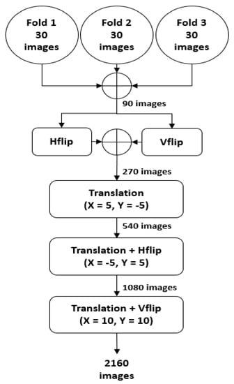 As mentioned in Section 4.1, the RPS-Net was trained with three-fold images and tested with the fourth fold of different patients using 4-fold cross-validation. The three folds consist of 90 images, which are not sufficient to train the RPS-Net. Therefore, artificial images were generated using the training images (90 for each fold) through the data augmentation process. In detail, the three folds were combined to make 90 images, and these images were horizontally and vertically flipped (H-flip and V-flip) to create 90 images each, which made a total of 270 images (90 (three folds)+ 90 (H-flip) + 90 (V-flip) = 270). These 270 images are then XY translated (X = 5, Y = −5) to make 540 images. In the next step, these 540 images were then XY translated (X = −5, Y = 5) again with a horizontal flip to create 1080 images. In the final step, the 1080 images from the previous stage were then XY translated (X = 10, Y = 10) with a vertical flip to create a total of 2160 images. A detailed visualization of the augmentation process is represented in Figure 4.